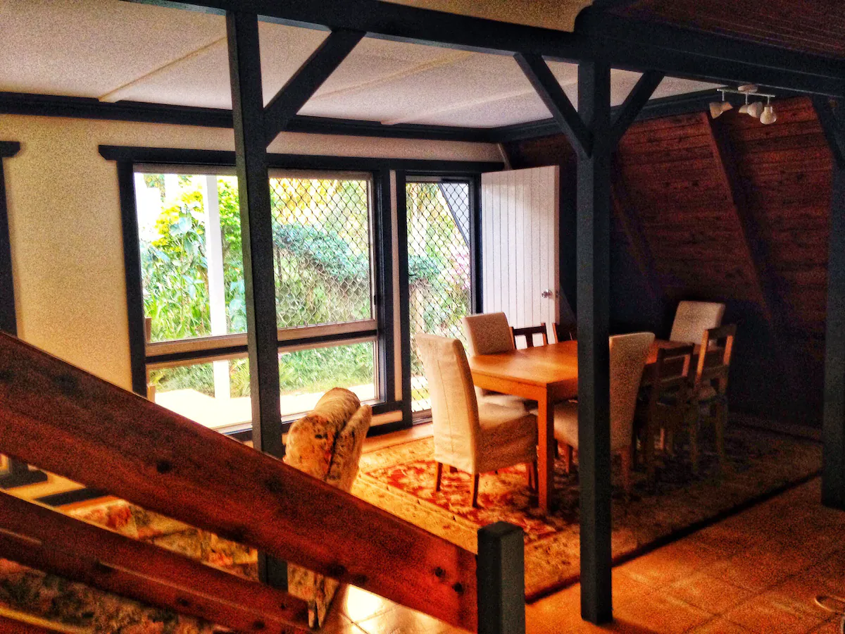 Indulge a while in a glamorous open plan chalet hidden in luxuriant rainforest within just a minute’s stroll of Gallery Walk. Superb ambiance with high ceilings, ceiling windows and a very high glass wall looking out directly into the palms, ferns & tree ferns.